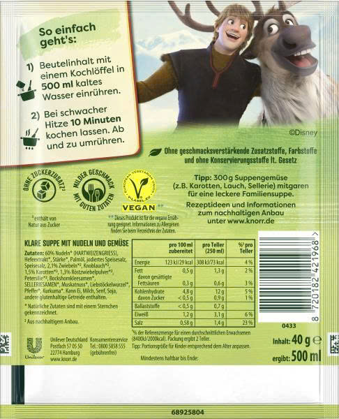 Bột súp Knorr với pasta Eiskonigin (chủ đề Elsa) là lựa chọn lý tưởng cho những bé yêu thích nhân vật Elsa trong phim Frozen. Món súp nóng hổi, thơm ngon với các mẩu pasta tạo hình dễ thương giúp bữa ăn trở nên thú vị hơn, khuyến khích bé ăn ngon miệng và hào hứng hơn với bữa ăn.