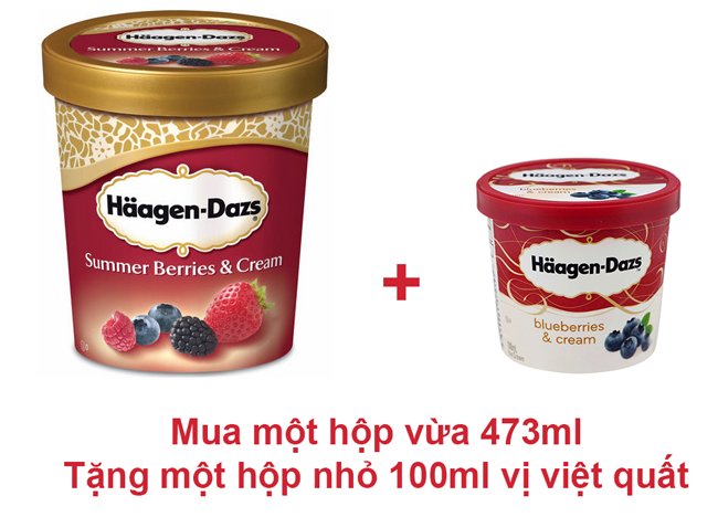 Khi khách hàng mua một hộp kem Häagen Dazs loại 473ml bất kỳ giá 220.000đ, quý khách sẽ được tặng thêm một hộp kem Häagen Dazs 100ml vị việt quất trị giá 60.000đ.