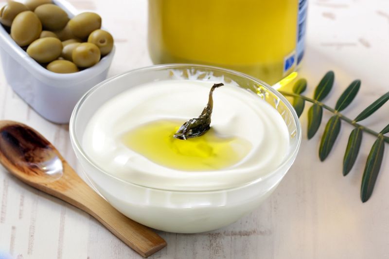 Kết hợp dầu oliu và sữa chua trong một cái bát nhỏ, khuấy đều.