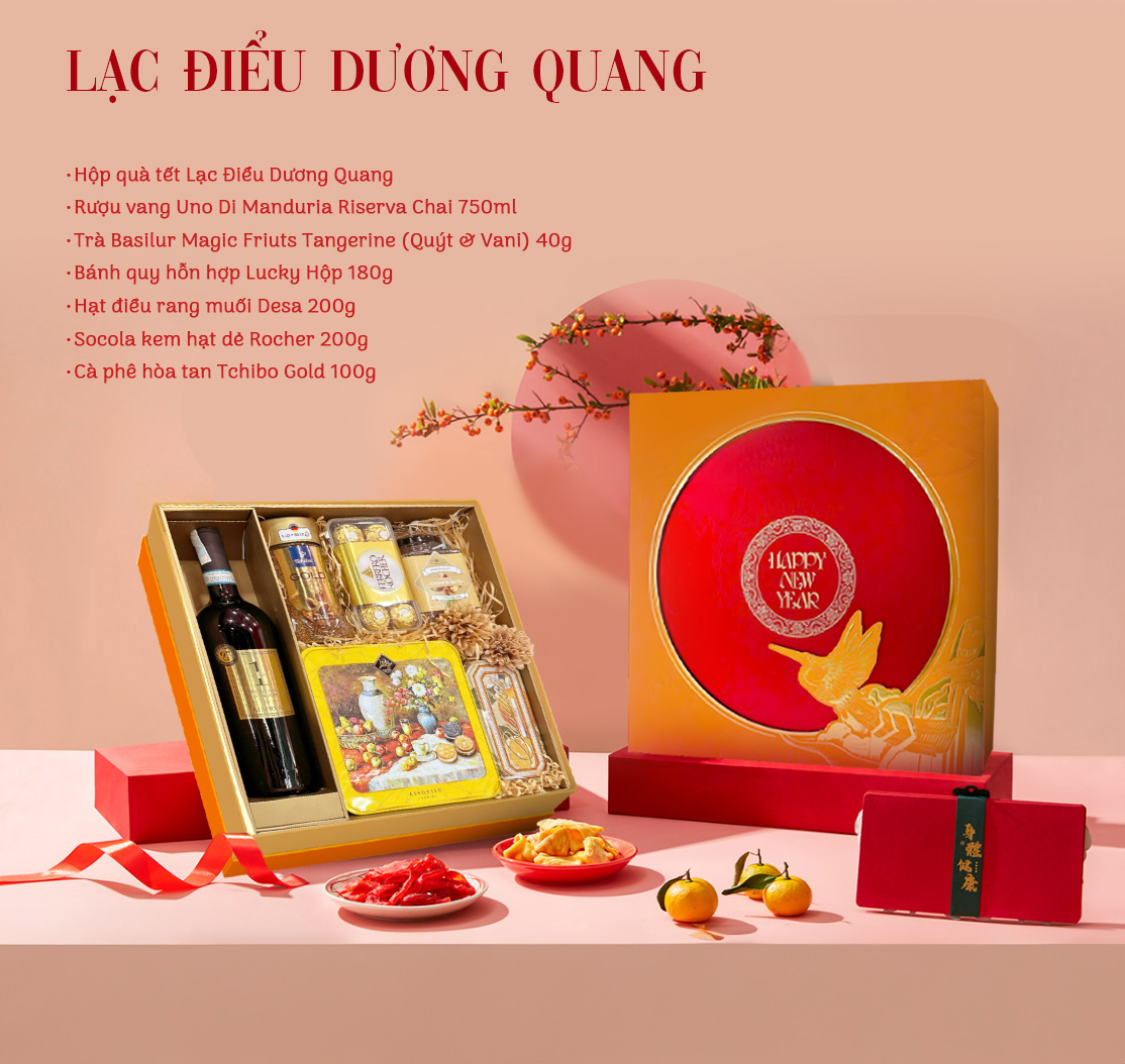 Hộp quà Tết Lạc Điểu Dương Quang 05 mang phong cách sang trọng với thiết kế lấy cảm hứng từ hình ảnh chim hạc, biểu tượng của sự trường thọ và phú quý. Sự kết hợp hoàn hảo giữa gam màu đỏ và vàng – đại diện cho may mắn và tài lộc – cùng chất liệu hộp cứng cáp, tinh tế, tạo nên một món quà vừa ý nghĩa vừa đẳng cấp.