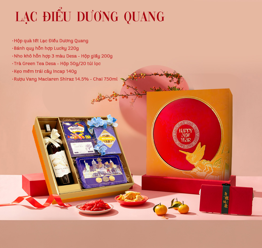 Hộp quà Tết Lạc Điểu Dương Quang được thiết kế với phong cách sang trọng, lấy cảm hứng từ chim hạc – biểu tượng của sự trường thọ và thịnh vượng. Sự phối hợp giữa sắc đỏ và vàng mang lại vẻ đẹp thanh lịch, đồng thời tượng trưng cho sự may mắn và tài lộc, khiến hộp quà trở thành món quà hoàn hảo cho dịp năm mới