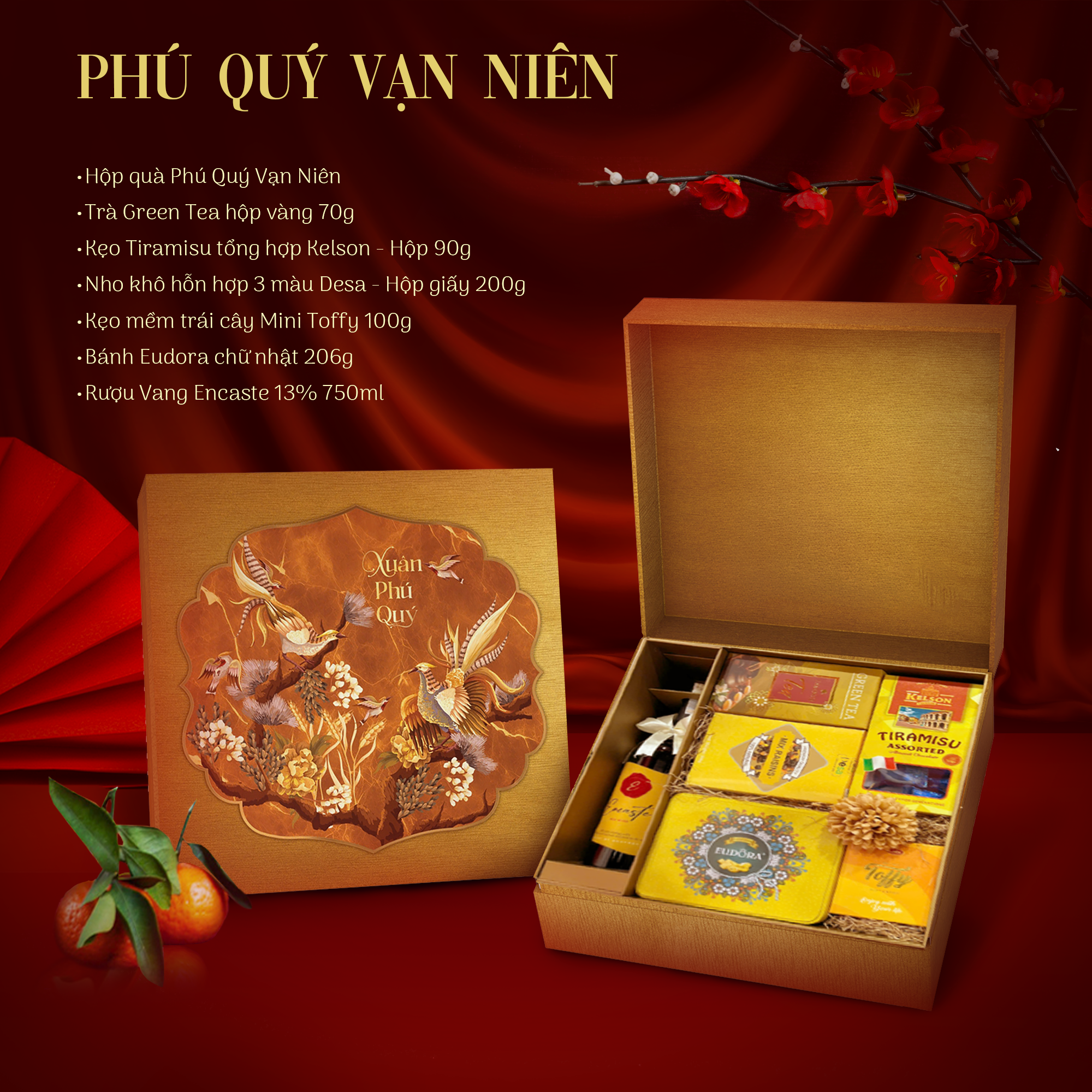 Với sắc vàng kim sang trọng, Phú Quý Vạn Niên là hiện thân của phú quý và thịnh vượng. Bộ quà không chỉ thể hiện sự đẳng cấp mà còn mang lời chúc về một năm mới tài lộc dồi dào, cuộc sống viên mãn và trường thọ dành tặng người trân quý.