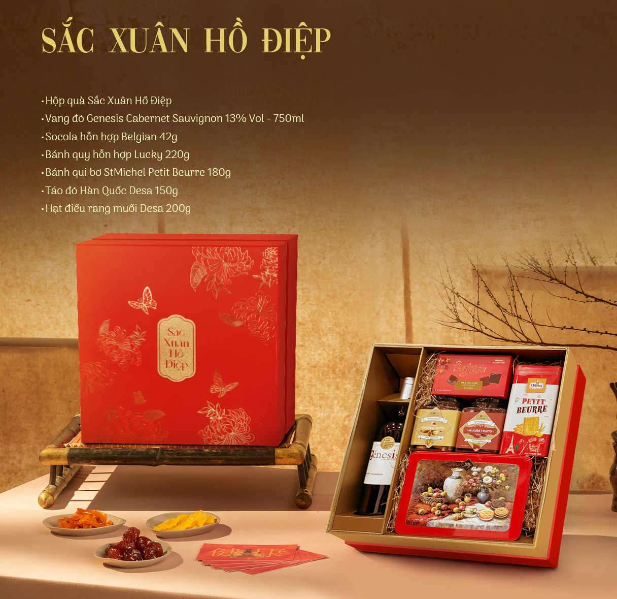 Hộp quà “Sắc Xuân Hồ Điệp” mang sắc đỏ rực rỡ, biểu tượng của may mắn và thịnh vượng, kết hợp cùng hình ảnh thẻ vàng tinh tế như lời chúc phát tài, phát lộc trong dịp năm mới. Màu đỏ, màu của Tết, của sự hân hoan đón chào những điều tốt đẹp, luôn được xem là biểu tượng cho niềm vui và hạnh phúc. Điểm nhấn vàng trên hộp quà tượng trưng cho sự phú quý, thành công và sự phát triển bền vững, một món quà gửi gắm những giá trị tốt đẹp đến đối tác và khách hàng trong năm mới.