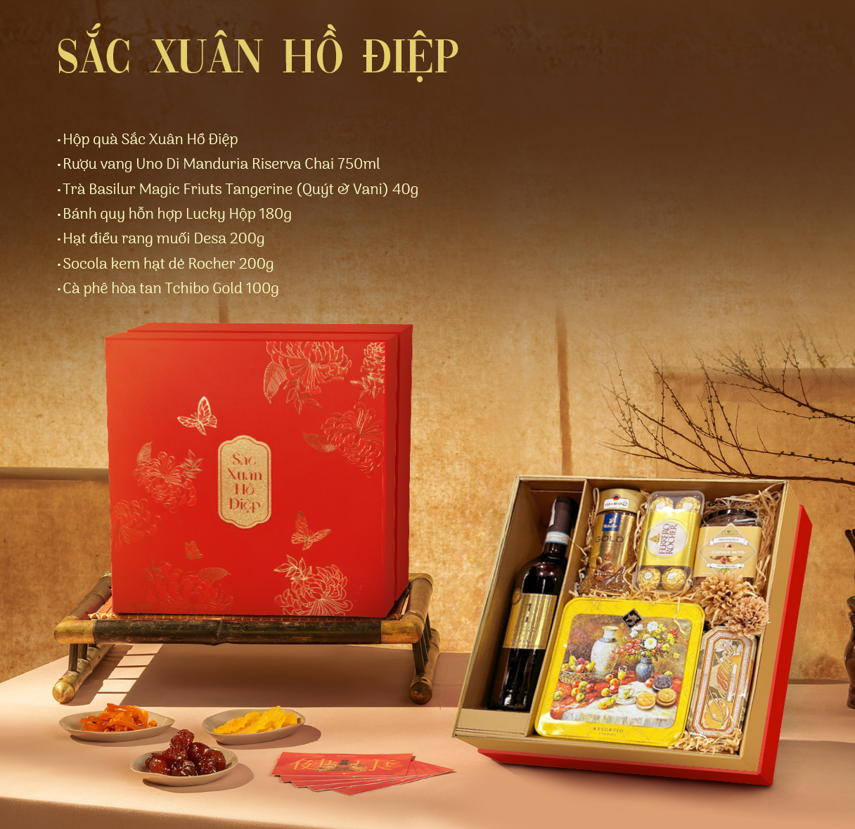 Sắc Xuân Hồ Điệp nổi bật với sắc đỏ rực rỡ, biểu tượng của Tết và sự hân hoan. Điểm nhấn vàng tinh tế tượng trưng cho sự thành công và phú quý, hộp quà là lời chúc trọn vẹn về tài lộc và hạnh phúc dành tặng đối tác, khách hàng trong năm mới.