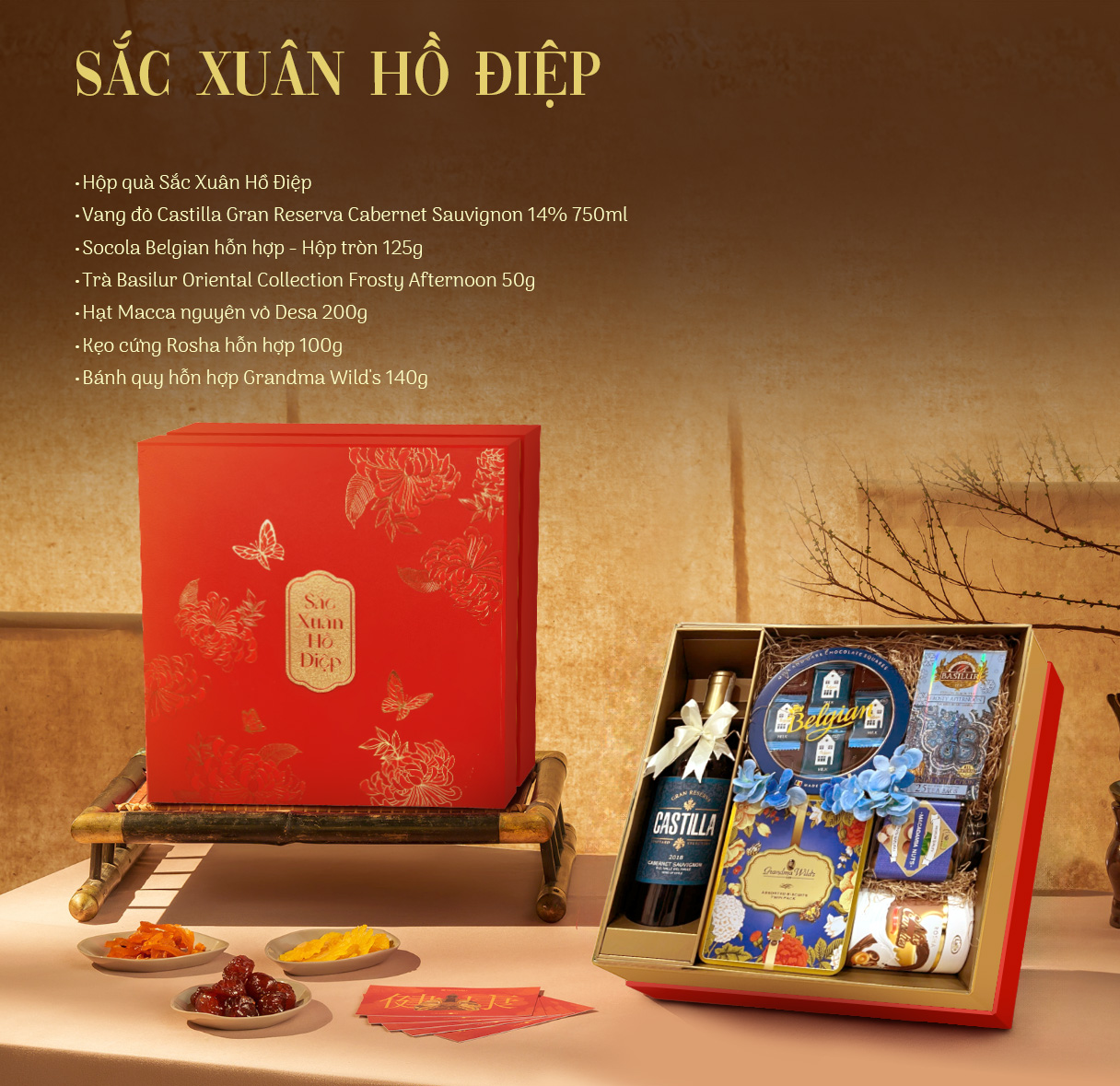 Hộp quà Tết 2025 Sắc Xuân Hồ Điệp 10 là món quà Tết sang trọng, được thiết kế tinh tế và chứa đựng những sản phẩm cao cấp, là lời chúc phúc lộc, may mắn và thành công dành cho người nhận trong năm mới. Với gam màu đỏ rực rỡ kết hợp với họa tiết bướm và hoa cúc, hộp quà tết tượng trưng cho sự khởi đầu mới, phú quý và thịnh vượng