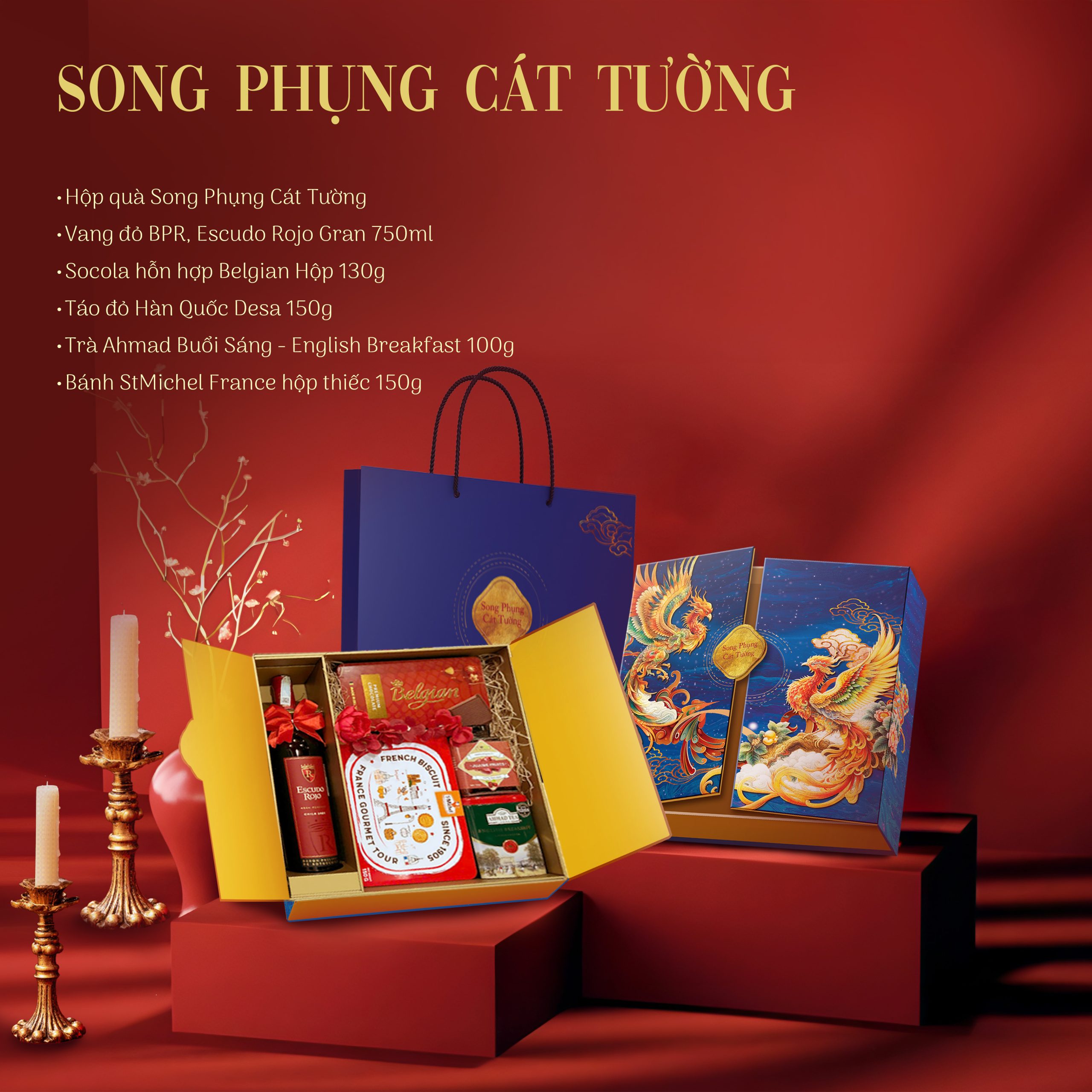 Hộp quà Song Phụng Cát Tường nổi bật với sắc xanh dương và vàng ánh kim, tạo nên vẻ đẹp sang trọng và đẳng cấp. Họa tiết đôi phượng hoàng lộng lẫy tượng trưng cho sự cân bằng, thịnh vượng và hạnh phúc, mang đến thông điệp tốt lành cho dịp Tết.