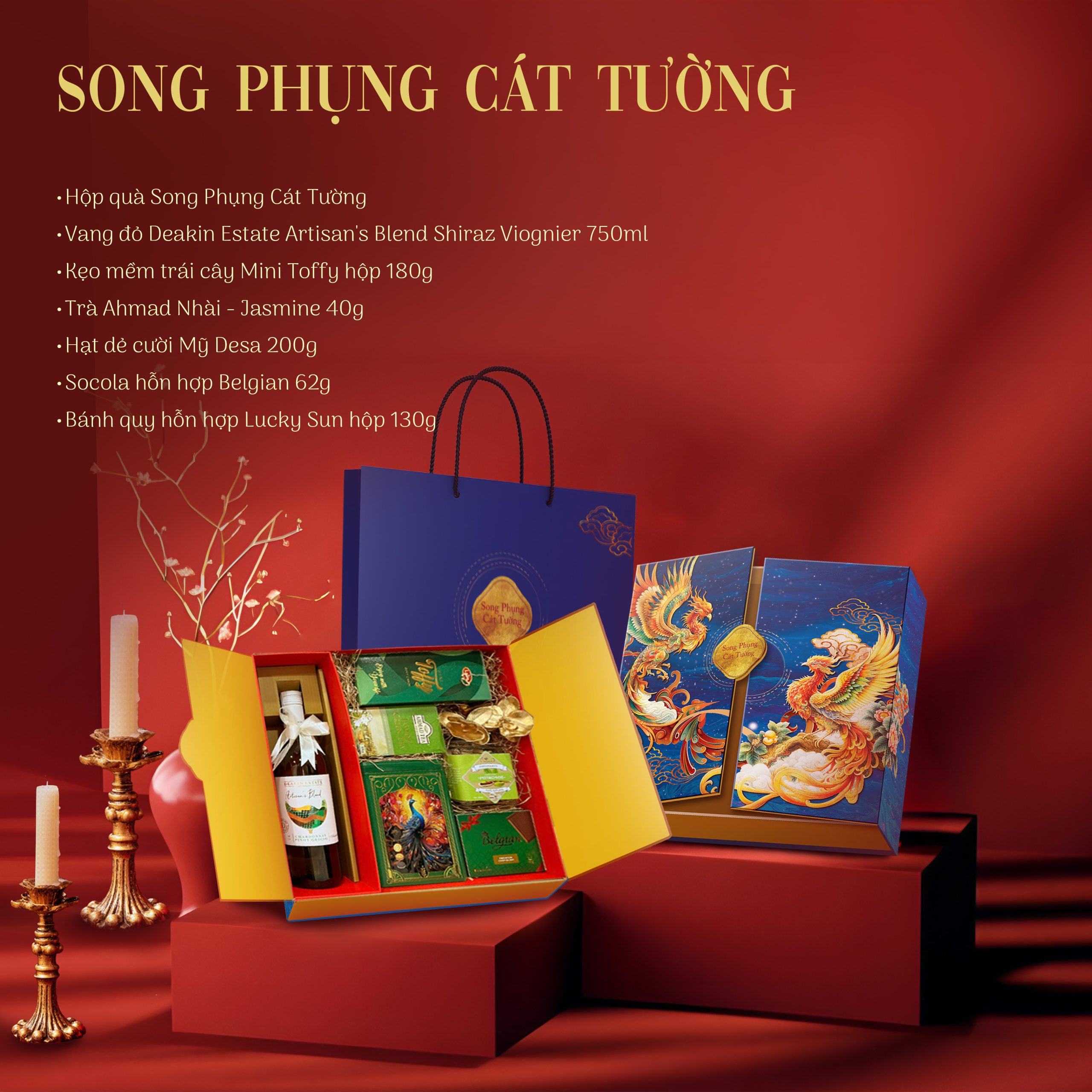 Hộp quà Tết Song Phụng Cát Tường nổi bật với hình ảnh đôi chim phượng hoàng, biểu tượng của sự hòa hợp và thịnh vượng. Tông màu xanh dương cùng những họa tiết ánh vàng tạo nên sự sang trọng và cao cấp, là món quà Tết tuyệt vời để dành tặng đối tác, khách hàng, và người thân.