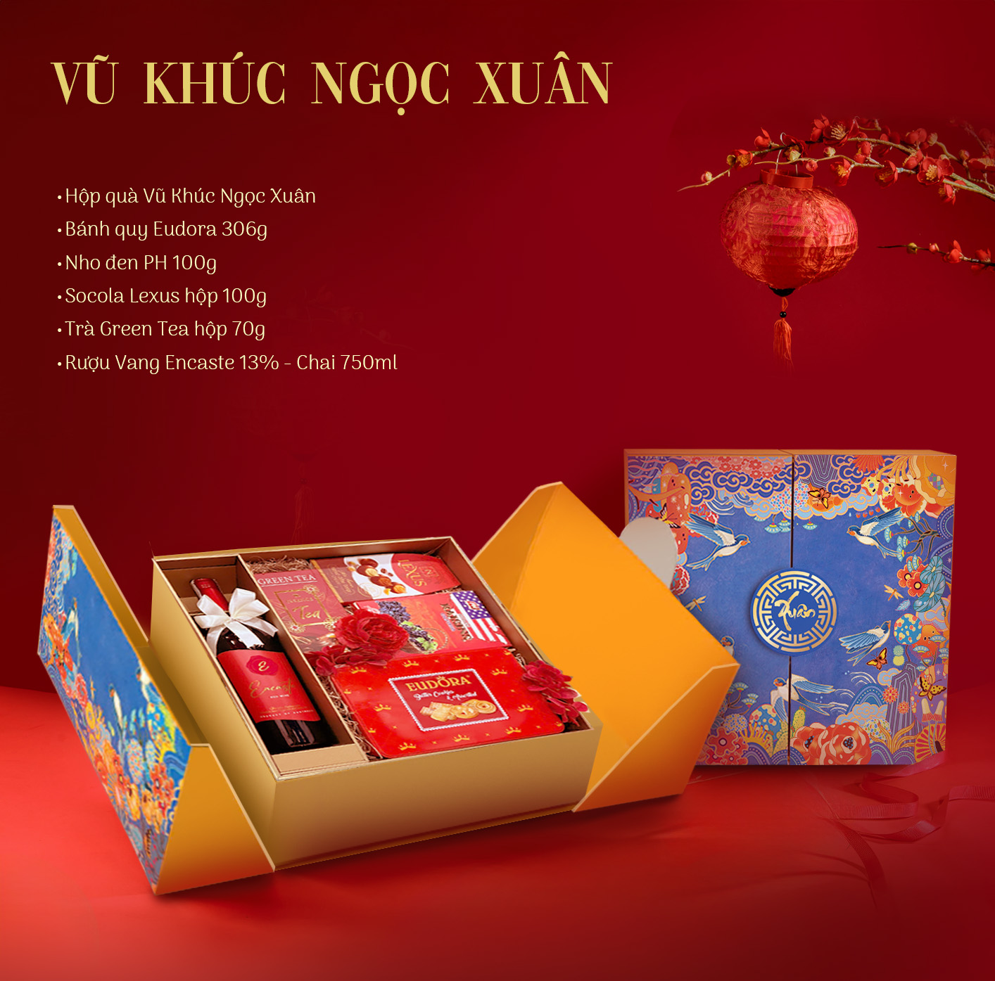Hộp quà Tết Vũ Khúc Ngọc Xuân nổi bật với gam màu xanh lam sang trọng, kết hợp họa tiết chim hạc và hoa mai đỏ – biểu tượng của sự may mắn và trường thọ. Thiết kế hộp tinh tế, kèm họa tiết dân gian cách điệu, mang đến vẻ đẹp truyền thống và hiện đại, phù hợp để trao gửi trong dịp Tết sum vầy.