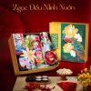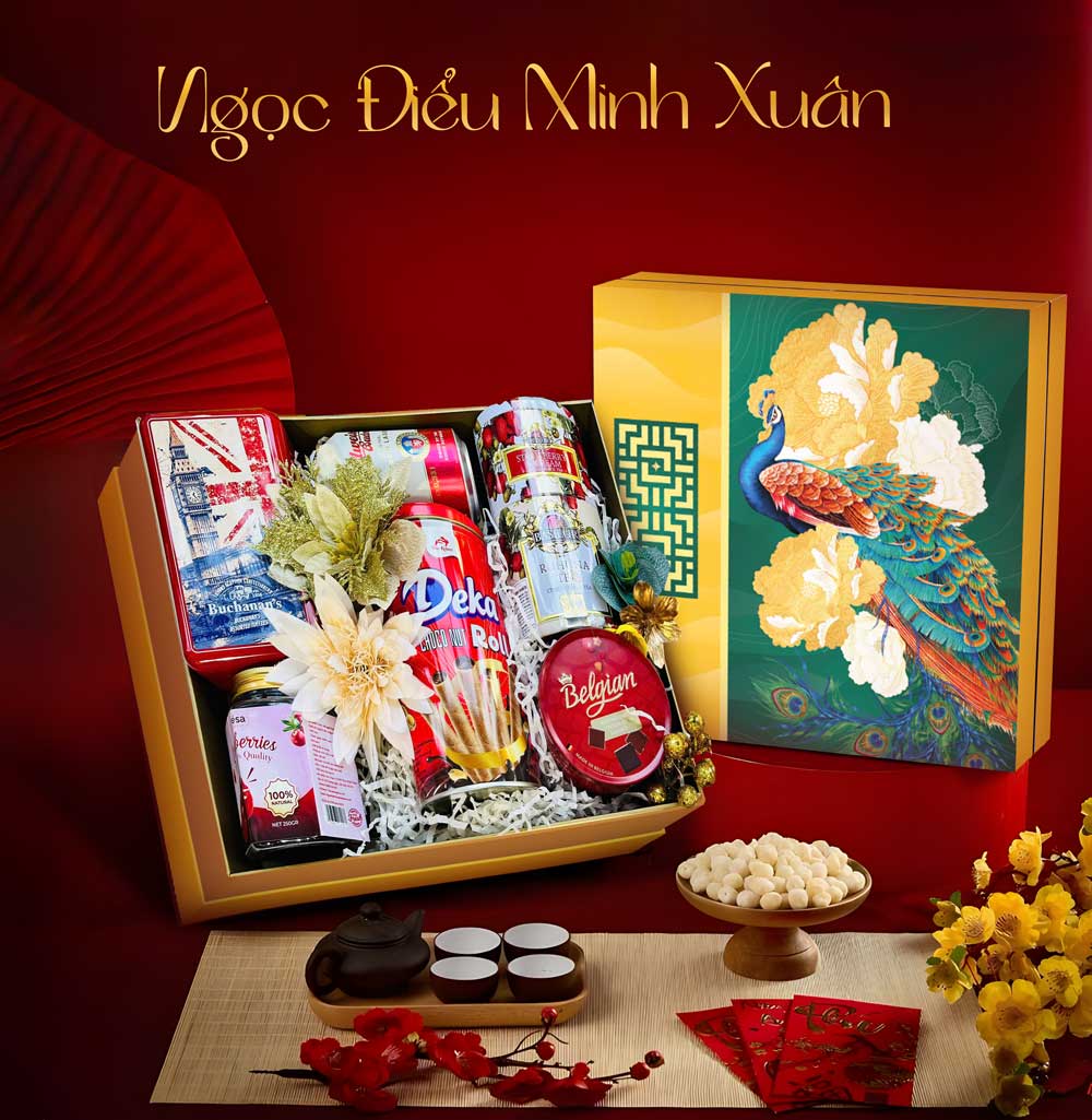 Tên gọi Ngọc Điểu Minh Xuân gợi hình ảnh chú chim quý báo hiệu mùa xuân rực rỡ. Hộp quà là lời chúc người nhận có một năm mới