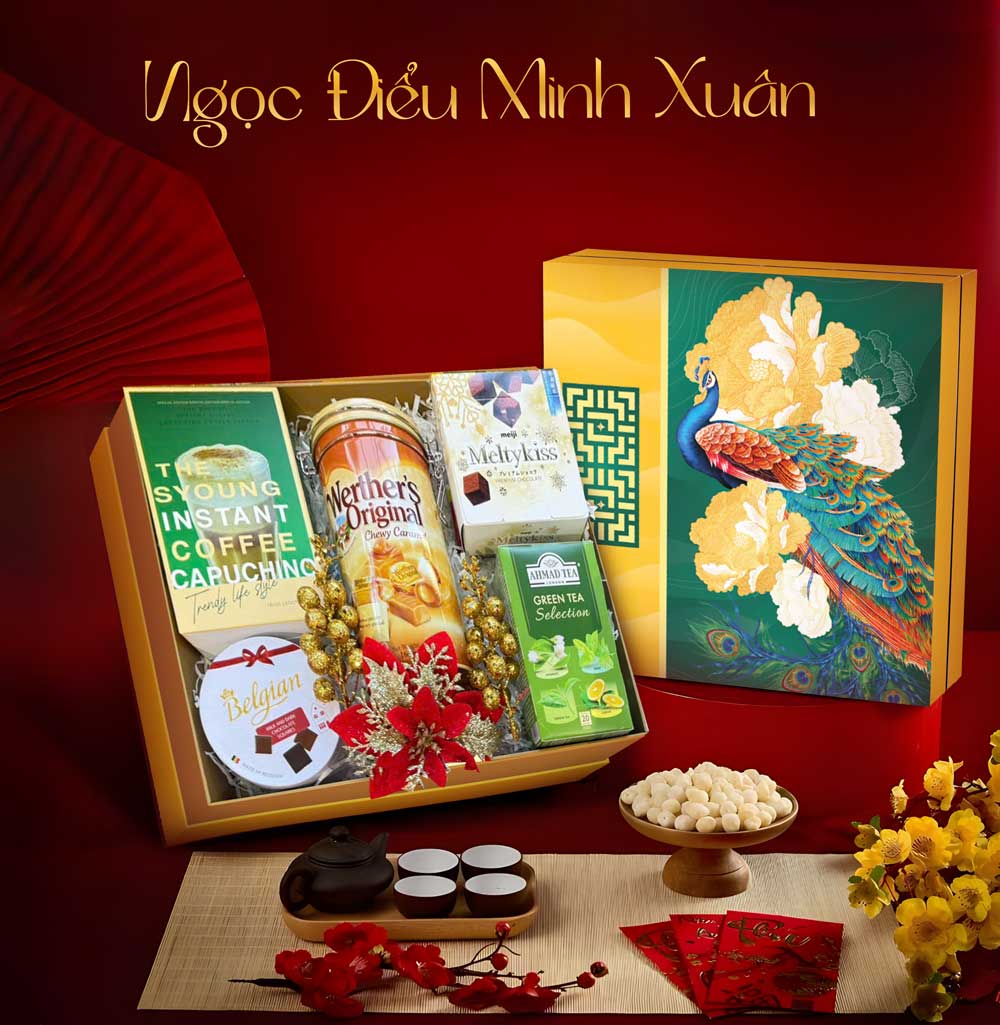 Hộp quà Tết cao cấp Ngọc Điểu Minh Xuân TP02 2026 được thiết kế dành riêng cho những ai yêu sự tinh tế, ưa chuộng sản phẩm nhập khẩu chất lượng. Sự kết hợp hài hòa giữa cà phê, socola, kẹo caramen và trà cao cấp mang đến một set quà hiện đại nhưng vẫn trọn vẹn ý nghĩa sum vầy ngày Tết.