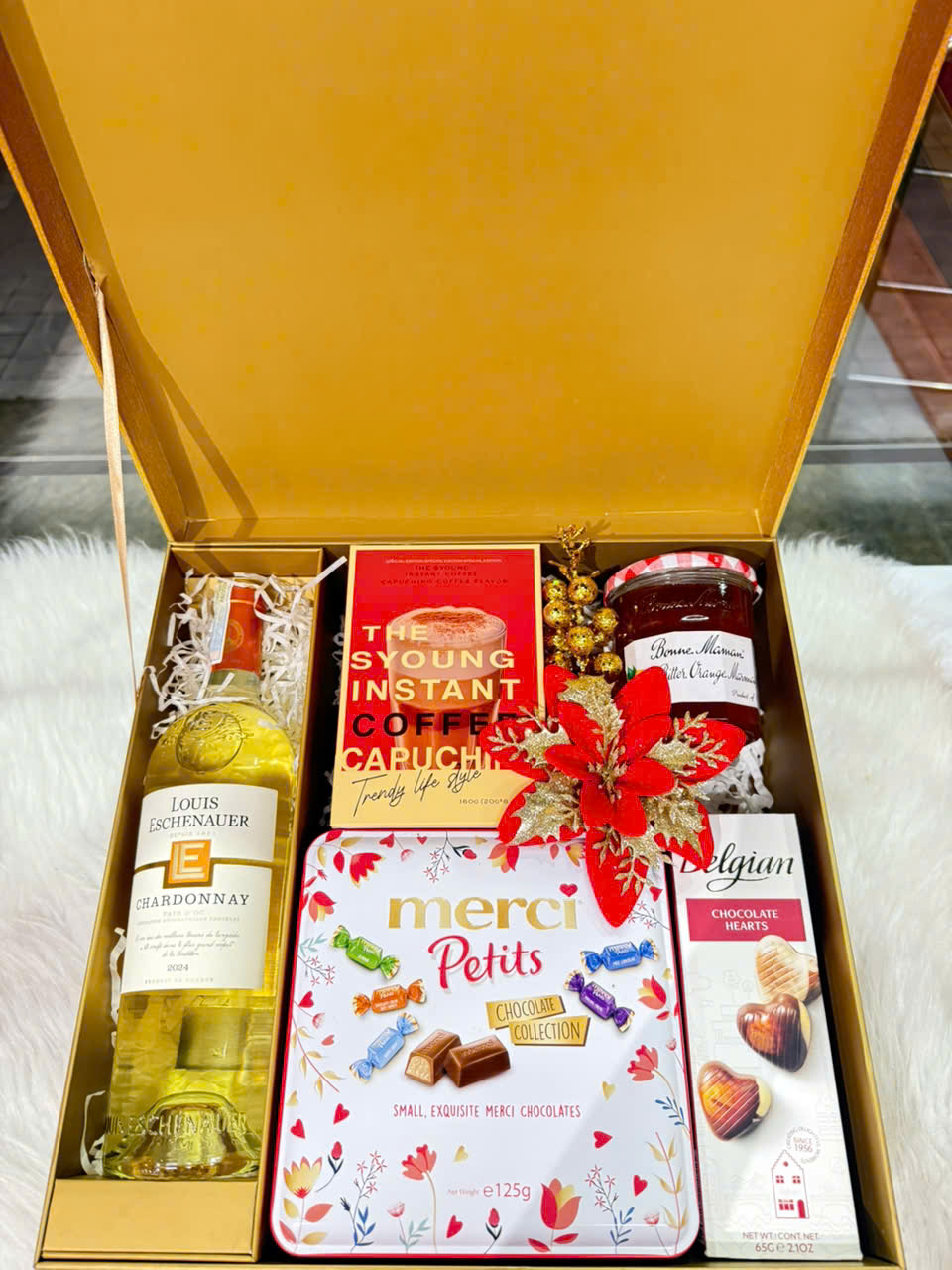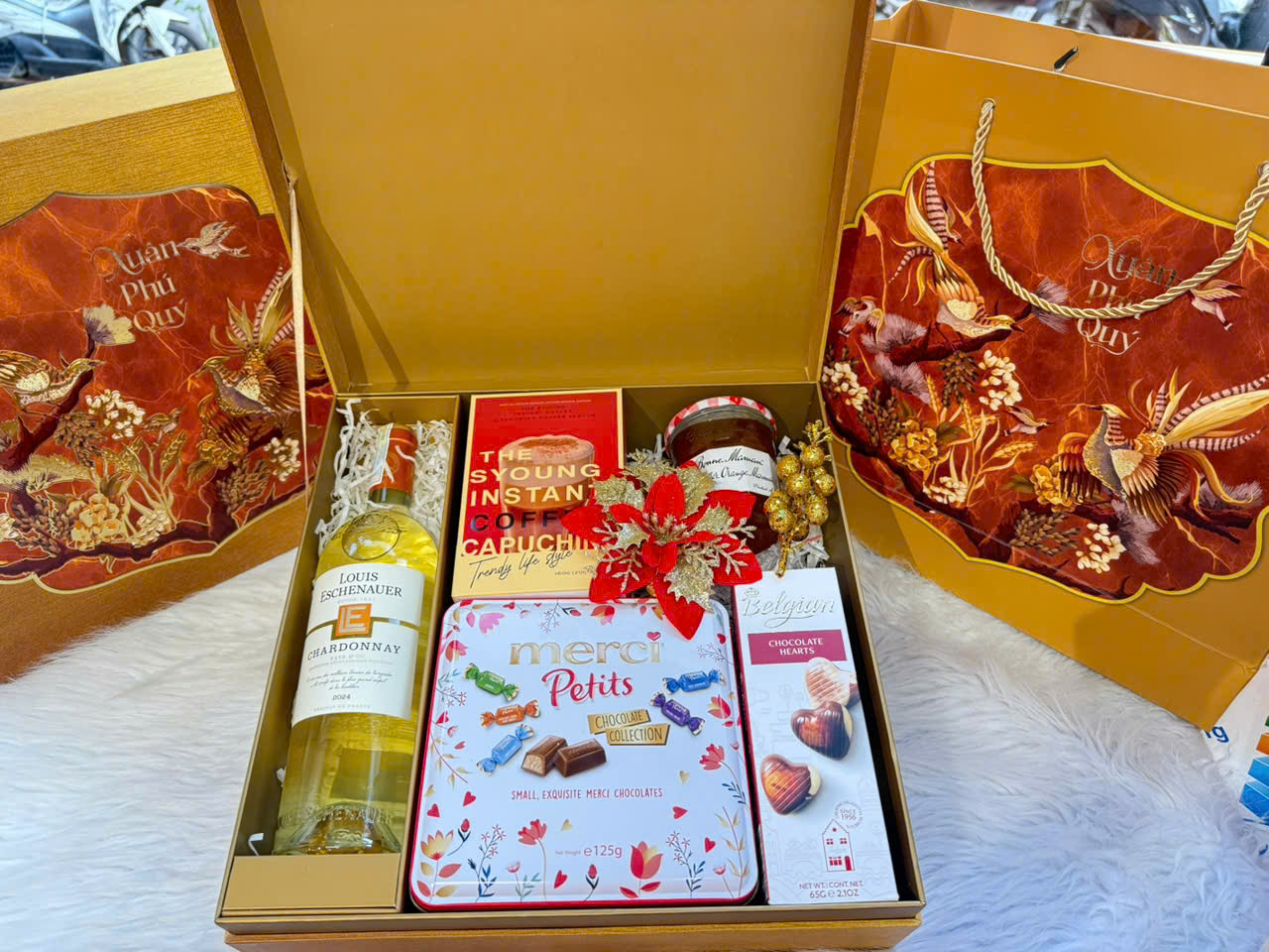 Sự kết hợp của vang trắng, socola, cà phê và mứt trái cây tạo nên hình ảnh một cuộc sống đủ đầy mà vẫn tinh tế, hiện đại mà vẫn ấm áp truyền thống. Đây là món quà phù hợp khi bạn muốn gửi lời chúc không chỉ cho một cái Tết an vui, mà còn cho cả một chặng đường dài thịnh vượng phía trước.
