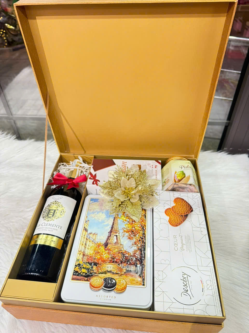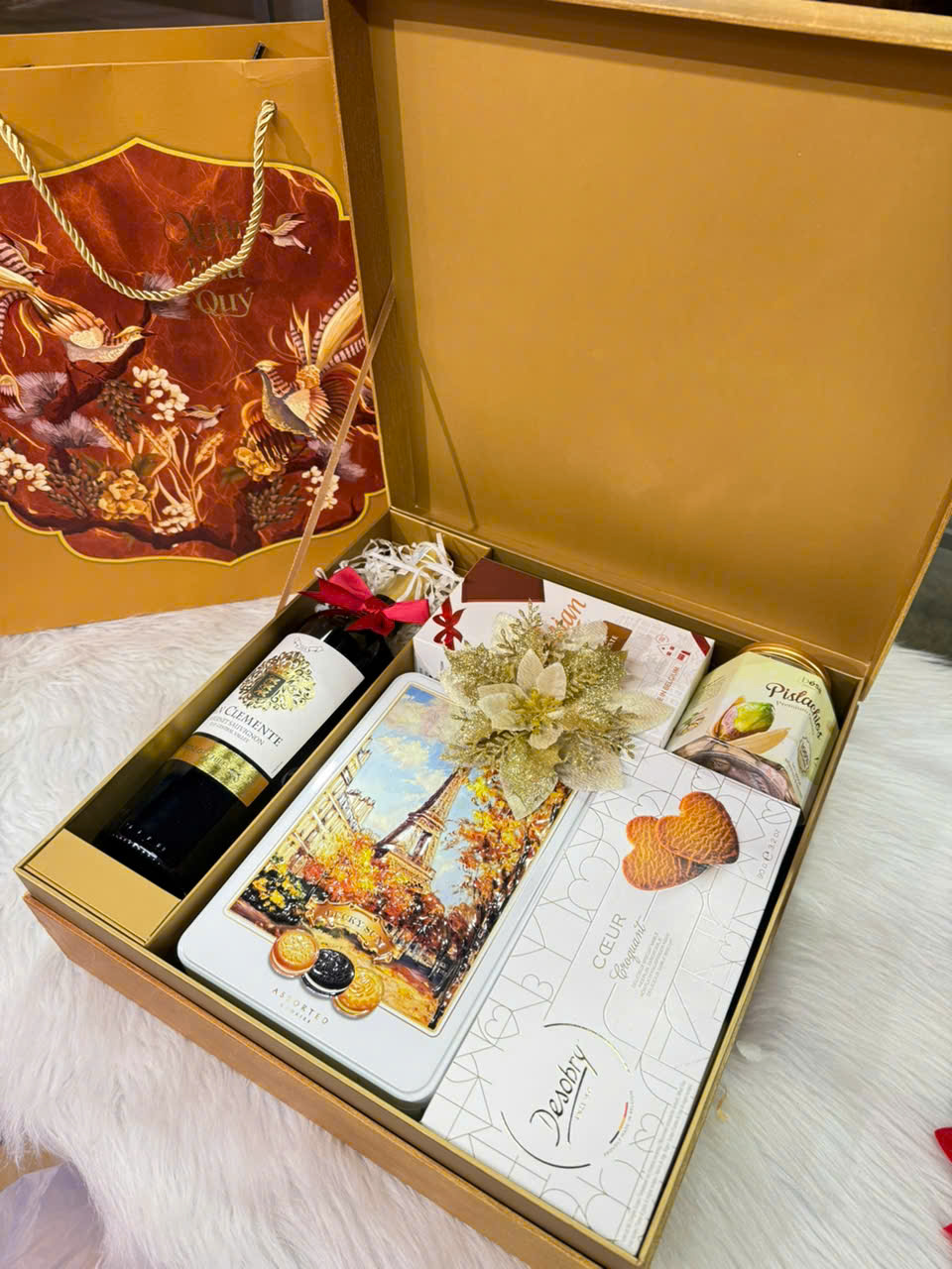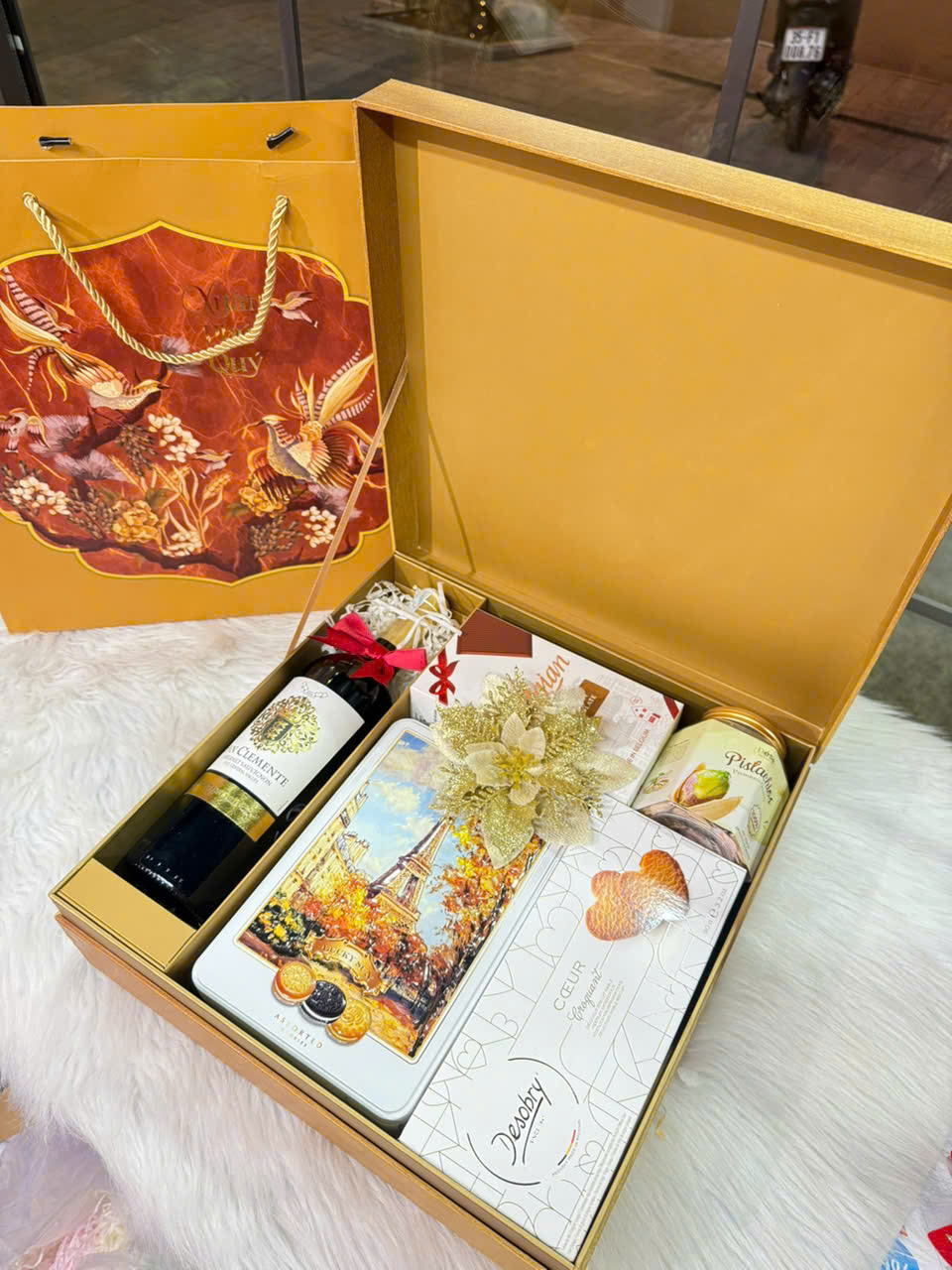 Bên trong mỗi hộp quà là sự kết hợp hài hòa giữa vang, socola, bánh quy và hạt dinh dưỡng, vừa đẹp mắt, vừa dễ dùng, thể hiện sự trân trọng của người tặng dành cho người nhận.