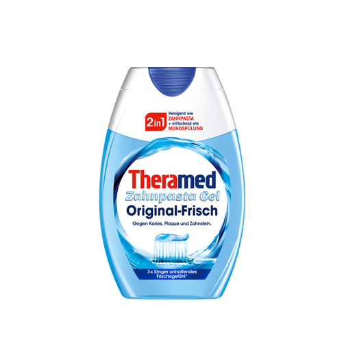 Kem đánh răng Theramed 2 in 1 Original Frisch đánh bật đến 99% vi khuẩn trên răng, giúp ngăn ngừa bị sâu răng & các bệnh về nướu. Bênh cạnh đó, nhờ công nghệ kết hợp nước súc miệng & kem đánh răng 2 trong 1, sản phẩm Theramed luồn sâu vào bên trong kẽ răng nơi bàn chải khó chạm vào được để giúp làm sạch các mảng bám trên răng.