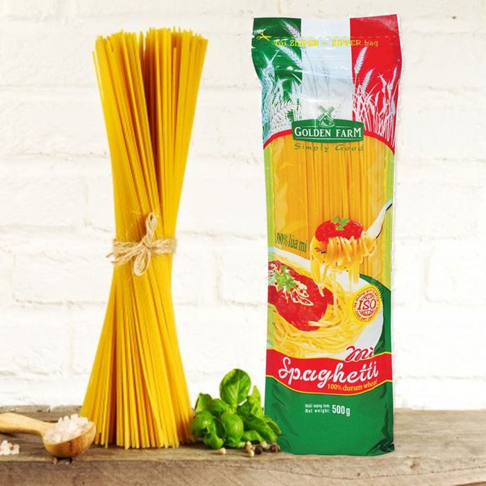 Mỳ Spaghetti Golden Farm 500g là lựa chọn kinh tế và chất lượng dành cho gia đình, quán ăn và các tiệm đồ Âu nhỏ. Dạng túi không khóa giúp giá thành tối ưu hơn nhưng chất lượng sợi vẫn đảm bảo tiêu chuẩn: vàng đẹp, dai ngon và không dễ nát khi nấu.
