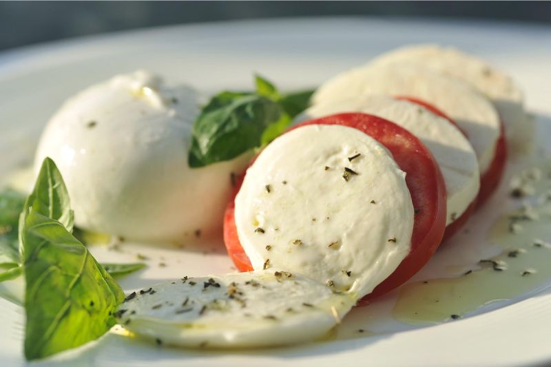 Salad Caprese: Cắt phô mai thành lát mỏng và kết hợp với cà chua, lá húng quế, dầu ô liu, và một chút muối để tạo nên món salad tươi mát, đầy dinh dưỡng.